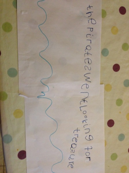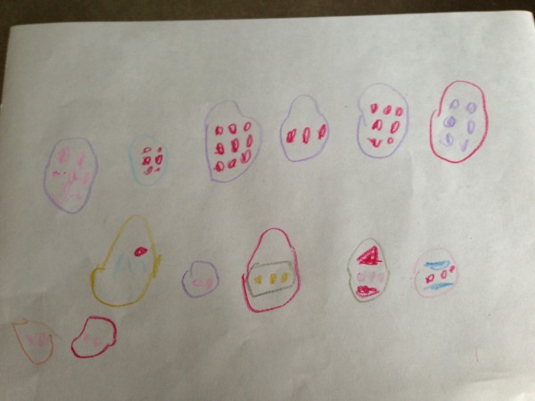 Back at home in the afternoon, I offered the children the chance to continue the finger painting activity. Tiddler was really too tired, and the big boys decided they had had enough painting for one day, so Rabbit and I did it together. This gave us the opportunity to focus on letter formation, and it was a really satisfying way to practise writing because any mistakes can be quickly “squished” and you can start again. We did the letters from a to e first, and then m for “mummy”, some capital letters and a number 7! Rabbit also enjoyed doing hand prints on paper, making “scratchy patterns” with her nails and drawing a spiral shaped fossil.