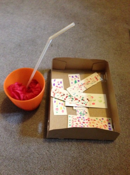 The night before last a conversation on twitter got me thinking about learning through play, and in particular messy play activities to support early reading and writing. So yesterday morning I decided that it was time to get the finger paint out, which I had bought a couple of weeks ago for this purpose. I scooped some red and green paint out onto paper plates and Monkey and Rabbit spread them around and started exploring the texture. Tiddler asked for white paint, so I found a black tray to give a more interesting contrast, but he asked for a paper plate so we transferred some of it onto one as well. Owl came and joined in and for a while all four of them were happily occupied with spreading, squidging and mark making. Then Owl extended the activity for the others by suggesting colour mixing, so we made brown and pink. After a while, I suggested they might like to write or draw in the paint, and they wrote several letters, and drew a bus, a train, a sun and some shapes.
