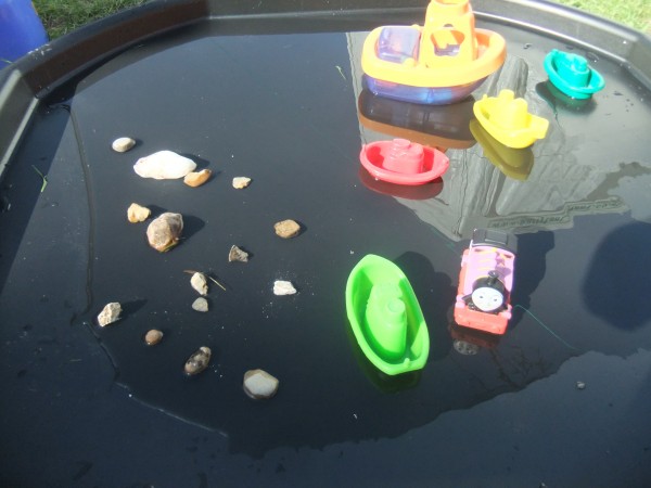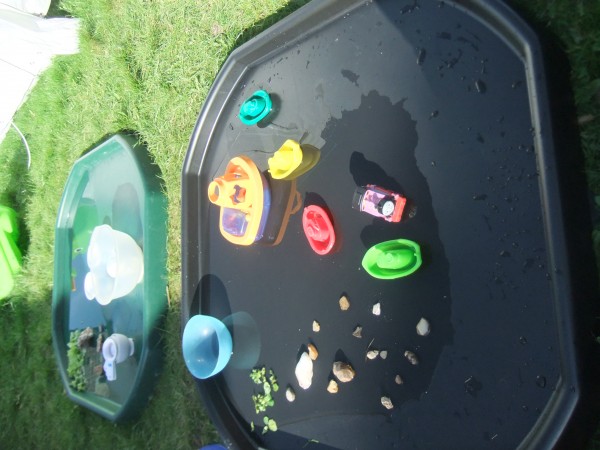 Sometimes the best things in life are unplanned. This is certainly true of the best opportunities to play. This afternoon it started with the arrival of our second tuff spot – one just wasn’t enough for four children (and all their visiting friends!) As soon as it arrived, the children were very keen to unwrap it and take it into the garden. We put it next to the other one and started to discuss what we might play with, but it was time for the big three to go to Dramabuds so I told them they would have to wait until after supper. While they were out, Tiddler wanted to sit in it, but the plastic had got too hot so I put some water in. He really enjoyed sitting in it and just splashing with his legs, and for a while he didn’t really need anything else. When he seemed to have had enough of that, I suggested he added some rocks from our collection, and he split them between the two tuff spots to make two beaches. We collected some boats from the bath and I gave him some pots and bowls for tipping and pouring. He played with them for a while, then went inside to look for something else to add. He returned with a bowl of lettuce which he had found in the fridge, which was rather cheeky, but funny, so I let him have it and we decided it was seaweed!