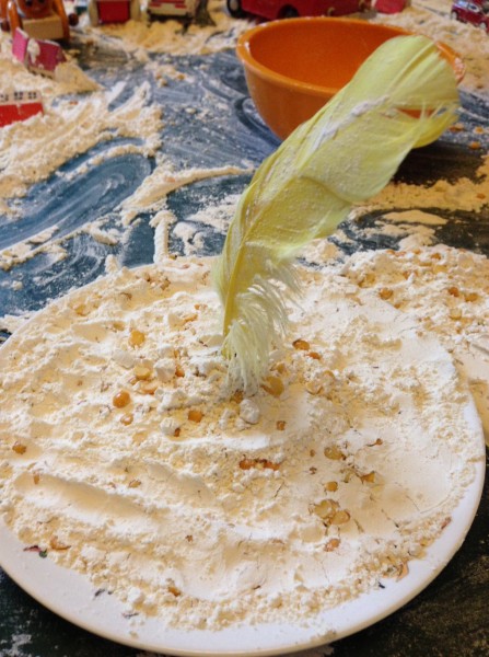 Back at home in the afternoon, I offered the children the chance to continue the finger painting activity. Tiddler was really too tired, and the big boys decided they had had enough painting for one day, so Rabbit and I did it together. This gave us the opportunity to focus on letter formation, and it was a really satisfying way to practise writing because any mistakes can be quickly “squished” and you can start again. We did the letters from a to e first, and then m for “mummy”, some capital letters and a number 7! Rabbit also enjoyed doing hand prints on paper, making “scratchy patterns” with her nails and drawing a spiral shaped fossil.