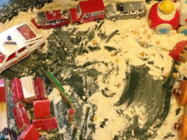 The night before last a conversation on twitter got me thinking about learning through play, and in particular messy play activities to support early reading and writing. So yesterday morning I decided that it was time to get the finger paint out, which I had bought a couple of weeks ago for this purpose. I scooped some red and green paint out onto paper plates and Monkey and Rabbit spread them around and started exploring the texture. Tiddler asked for white paint, so I found a black tray to give a more interesting contrast, but he asked for a paper plate so we transferred some of it onto one as well. Owl came and joined in and for a while all four of them were happily occupied with spreading, squidging and mark making. Then Owl extended the activity for the others by suggesting colour mixing, so we made brown and pink. After a while, I suggested they might like to write or draw in the paint, and they wrote several letters, and drew a bus, a train, a sun and some shapes.