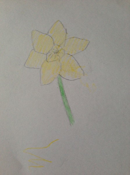At the end of the afternoon, after a little bit of thank-you letter writing, we decided to draw some daffodils for our Spring display. This was a second attempt, after drawing some flowers last week which were beautiful but didn’t look like daffodils! This time, we looked carefully at the flowers, and discussed the shape of the petals and the trumpet before we started. There was some initial reluctance as it seemed quite challenging, but they soon got into it and decided it was fun after all. Tiddler did not want to be left out so I drew him a flower to colour. But then he asked me to do the yellow bit for him. And then the green bit. However, he did write his name. It is the yellow squiggle under the picture which you can see if you look really really closely!