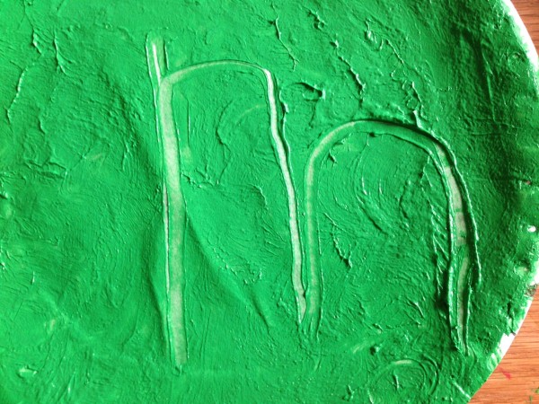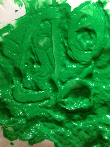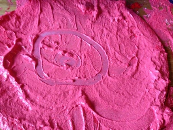 Back at home in the afternoon, I offered the children the chance to continue the finger painting activity. Tiddler was really too tired, and the big boys decided they had had enough painting for one day, so Rabbit and I did it together. This gave us the opportunity to focus on letter formation, and it was a really satisfying way to practise writing because any mistakes can be quickly “squished” and you can start again. We did the letters from a to e first, and then m for “mummy”, some capital letters and a number 7! Rabbit also enjoyed doing hand prints on paper, making “scratchy patterns” with her nails and drawing a spiral shaped fossil.
