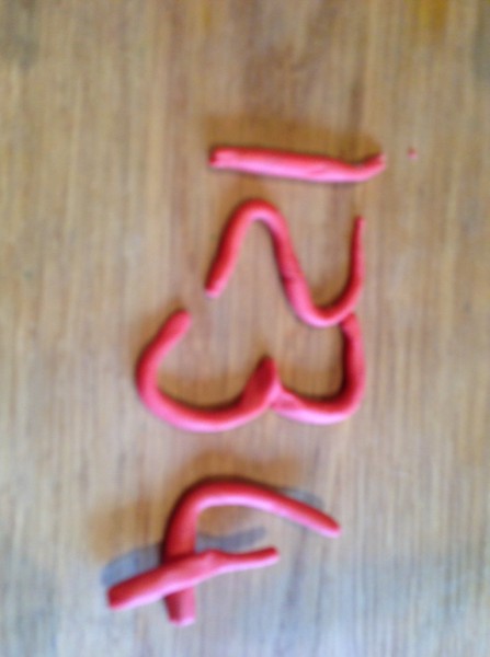 After snack time (some fruit arranged in a pretty pattern by Rabbit), we did some Maths together. The boys were working on their times tables, and I decided to set up an “invitation to play” with plasticine for Rabbit. I started making numbers, but had only made two when Tiddler came over and wanted to sit on my knee and “help” me. He enjoyed counting the numbers, starting at 1 again every time I made a new one, carefully pointing to each number in turn. He also self-corrected consistently, going back to the start when he made a mistake. I knew he could count to ten (at least) but wasn’t sure if he had mastered one-to-one correspondence yet. Well it looks like he has! While we were doing this, Rabbit came over to watch and I suggested she might like to make some numbers of her own. She worked very hard to make the numbers 1 to 4 and was very pleased with the results. She needed a little help to get the 3 to be the right shape, but did the others herself.