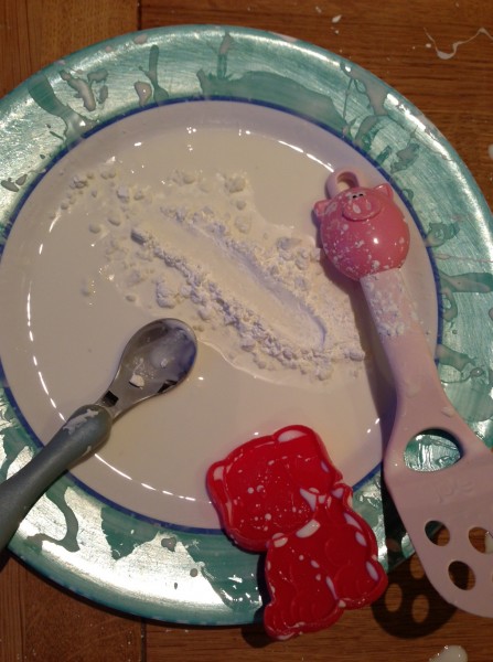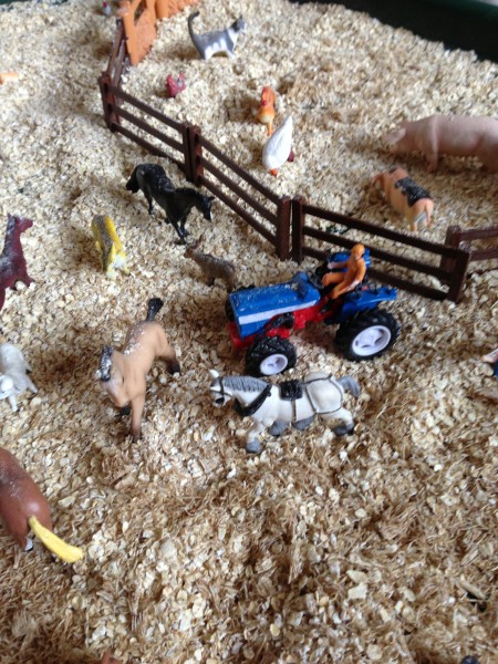 The children played with the farm scene nicely for a while, and then a few of them decided it would be more fun to throw the oats. So we moved the Tuff Spot outside! This meant that the children spread out a bit and found other things to do. They decided to fill up the play sink with water, and then inevitably decided to add some oats. They made a lovely mess and it kept them busy all afternoon. You can read another version of events here.