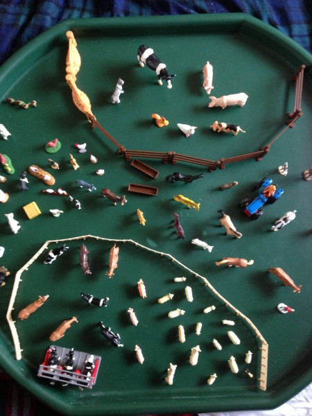 Yesterday our friends from The Adequate Parent and 3 Kids and a Gluestick came over and I decided it would be a good opportunity to get going on our Farm topic with some more messy play in the Tuff Spot. Owl spent a long time carefully setting up the farm animals and fences, and then I added two large bags of oats, and a few shredded wheat. Some of the children helped to crumble the shredded wheat up; Tiddler particularly enjoyed this, and was happily occupied eating it for quite a while.