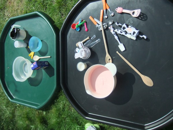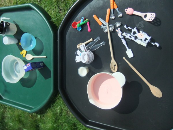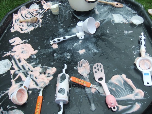 In the dry Tuff Spot, Monkey spent a long time setting up a farm with some help from Owl.  They really enjoyed their intricate, careful play while the two younger children were happily occupied with their messy kitchen.  With help from Supergirl, Rabbit and Tiddler stirred and poured, made porridge and enjoyed the texture of the wet oaty mess.  They also collected apples from the garden and rolled out some pink icing to make cakes.  I love seeing the different ways my children play and the way it reflects their personalities.