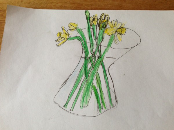 At the end of the afternoon, after a little bit of thank-you letter writing, we decided to draw some daffodils for our Spring display. This was a second attempt, after drawing some flowers last week which were beautiful but didn’t look like daffodils! This time, we looked carefully at the flowers, and discussed the shape of the petals and the trumpet before we started. There was some initial reluctance as it seemed quite challenging, but they soon got into it and decided it was fun after all. Tiddler did not want to be left out so I drew him a flower to colour. But then he asked me to do the yellow bit for him. And then the green bit. However, he did write his name. It is the yellow squiggle under the picture which you can see if you look really really closely!