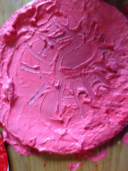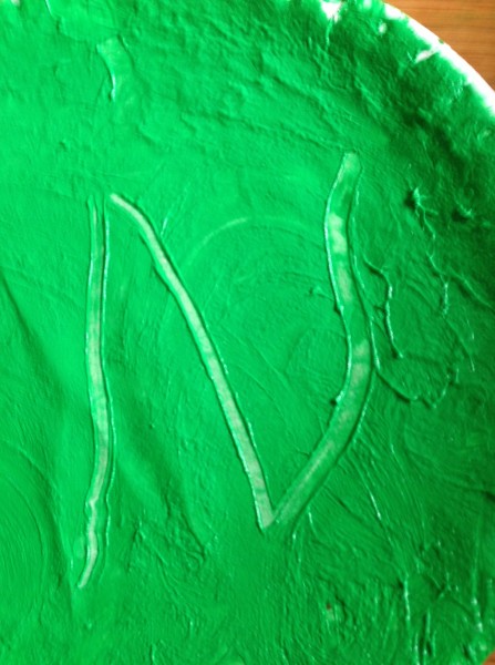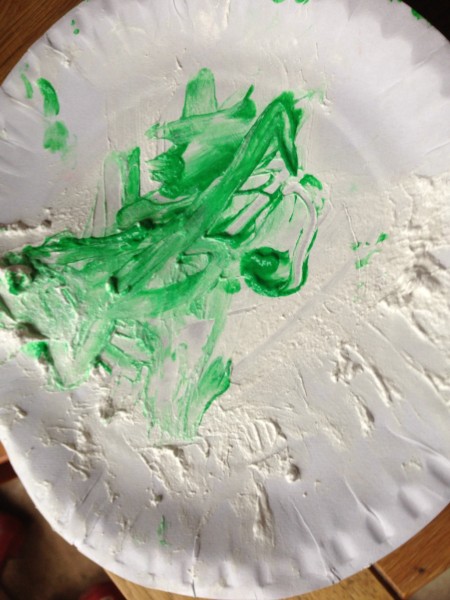 Back at home in the afternoon, I offered the children the chance to continue the finger painting activity. Tiddler was really too tired, and the big boys decided they had had enough painting for one day, so Rabbit and I did it together. This gave us the opportunity to focus on letter formation, and it was a really satisfying way to practise writing because any mistakes can be quickly “squished” and you can start again. We did the letters from a to e first, and then m for “mummy”, some capital letters and a number 7! Rabbit also enjoyed doing hand prints on paper, making “scratchy patterns” with her nails and drawing a spiral shaped fossil.