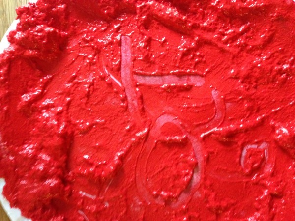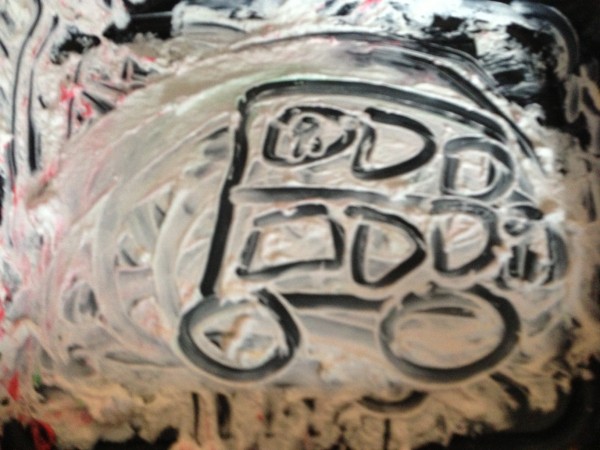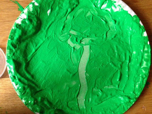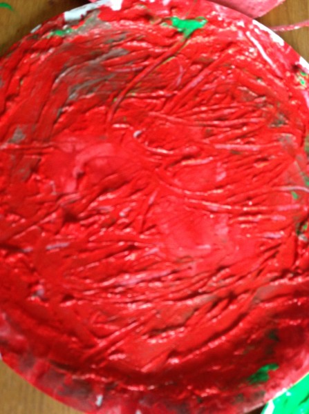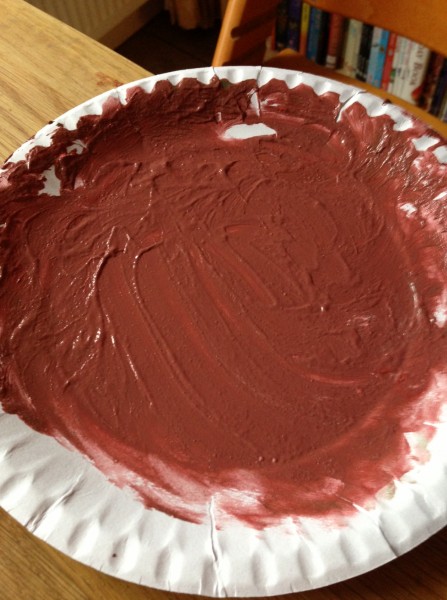 The night before last a conversation on twitter got me thinking about learning through play, and in particular messy play activities to support early reading and writing. So yesterday morning I decided that it was time to get the finger paint out, which I had bought a couple of weeks ago for this purpose. I scooped some red and green paint out onto paper plates and Monkey and Rabbit spread them around and started exploring the texture. Tiddler asked for white paint, so I found a black tray to give a more interesting contrast, but he asked for a paper plate so we transferred some of it onto one as well. Owl came and joined in and for a while all four of them were happily occupied with spreading, squidging and mark making. Then Owl extended the activity for the others by suggesting colour mixing, so we made brown and pink. After a while, I suggested they might like to write or draw in the paint, and they wrote several letters, and drew a bus, a train, a sun and some shapes.