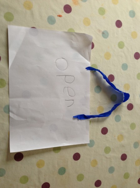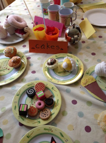 Rabbit made a cafe with real and toy food, and wrote labels for the food and drinks. She also made Smarties and carried them around the house in a tray, selling them.