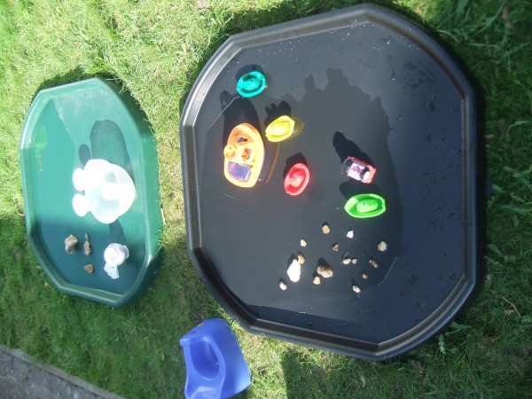Sometimes the best things in life are unplanned. This is certainly true of the best opportunities to play. This afternoon it started with the arrival of our second tuff spot – one just wasn’t enough for four children (and all their visiting friends!) As soon as it arrived, the children were very keen to unwrap it and take it into the garden. We put it next to the other one and started to discuss what we might play with, but it was time for the big three to go to Dramabuds so I told them they would have to wait until after supper. While they were out, Tiddler wanted to sit in it, but the plastic had got too hot so I put some water in. He really enjoyed sitting in it and just splashing with his legs, and for a while he didn’t really need anything else. When he seemed to have had enough of that, I suggested he added some rocks from our collection, and he split them between the two tuff spots to make two beaches. We collected some boats from the bath and I gave him some pots and bowls for tipping and pouring. He played with them for a while, then went inside to look for something else to add. He returned with a bowl of lettuce which he had found in the fridge, which was rather cheeky, but funny, so I let him have it and we decided it was seaweed!