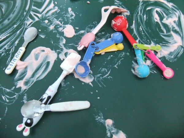 When he had finished playing with his beaches, we combined the two into one tuff spot, and he and Supergirl played with playdough in the other one while I got the supper ready. When the others came back from Dramabuds we had supper, then I gave them a big bowl of strawberry angel delight in one of the tuff spots, with lots of spoons and other kitchen utensils. They had fun playing with it, making patterns, writing letters, drawing pictures and eating it! I think the big boys may have eaten most of it, so I gave them all a yoghurt afterwards to make sure they had enough pudding. Anyway, angel delight is a big hit and I’m sure we’ll be playing with it – and eating it again. I just won’t look too closely at the list of ingredients. After years of serving up organic fruit and yoghurt for pudding, with the occasional home-made apple crumble, it is a bit of a U-turn to be giving them angel delight. But they love it, and it certainly makes a good satisfying mess!