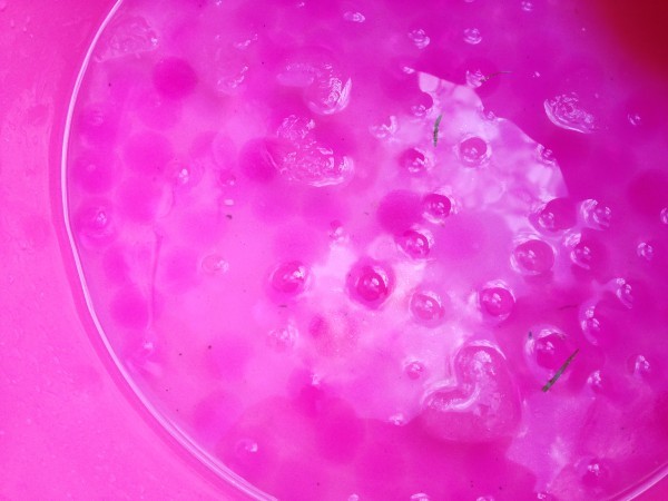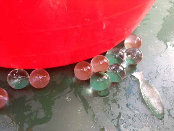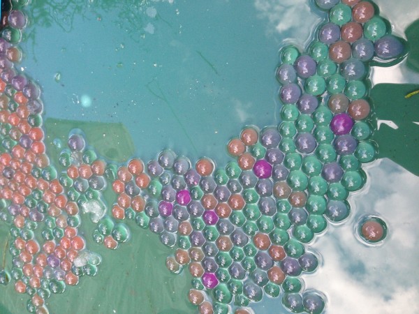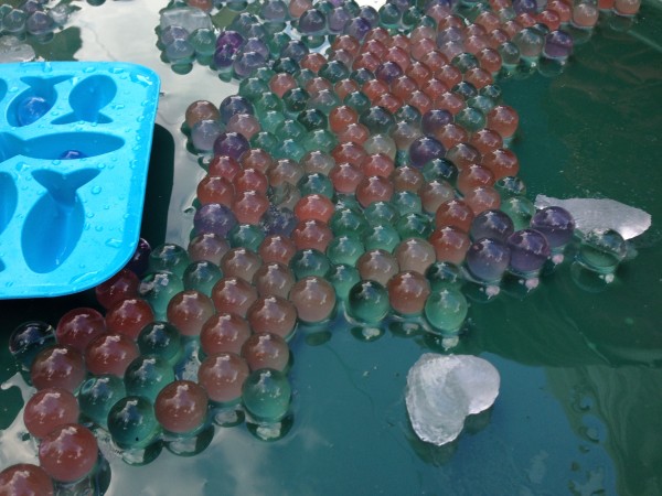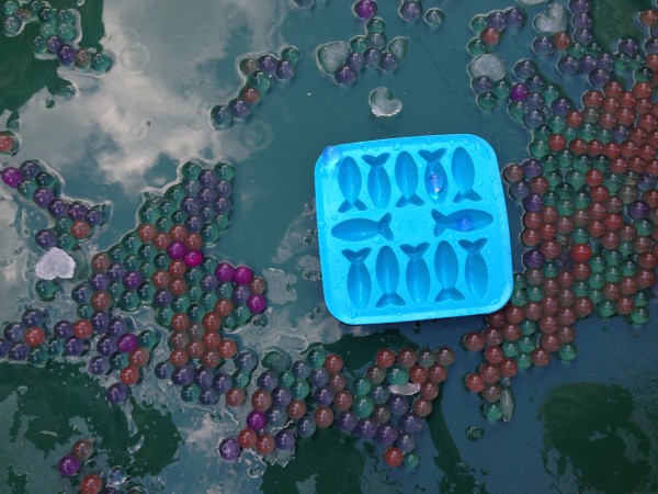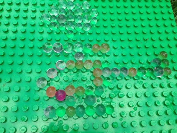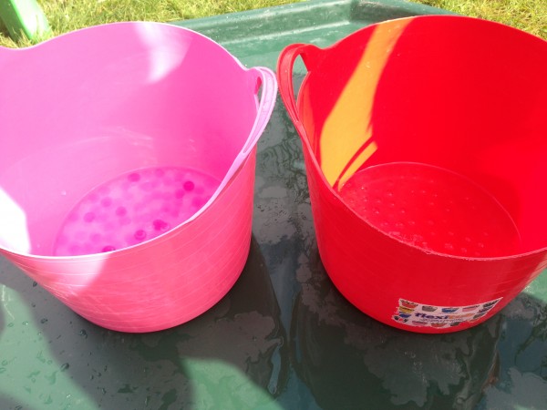 On Friday afternoon, we played with our new water beads. They arrived on Thursday and I soaked three packs overnight in two plastic tubs of water – red in the red tub, pink in the pink tub, and clear beads split between the two tubs. I had been going to add food colouring until I remembered we didn’t have any, so instead I added some peppermint essence which made the water smell lovely. I also made peppermint-scented ice cubes (hearts and fish.) When we were ready to play, I put the tubs with the water beads on to the Tuff Spot which was out in the garden, and the children helped me to add the ice cubes. They spent a little while exploring the textures of the beads and the ice in the tubs, before deciding to tip them all into the Tuff Spot. This made it easier for all four children to play with them at once. Tiddler spent quite a long time concentrating on carefully placing the water beads in the empty fish ice cube tray, and Rabbit did the same thing with the heart tray. Monkey was wearing his new tool belt, so used his hammer to explore and play with the beads. Luckily, he did this very gently as it is a real hammer. Tiddler then went to get his toy hammer and bashed the ice and beads as hard as he could! Owl made a picture of a helicopter by placing the beads on the studs of a Lego Duplo base board. After a while, Rabbit and Tiddler couldn’t resist getting into the Tuff Spot so I added quite a lot more (warm) water and this extended the play for a while longer. I enjoyed watching them play, some of the time together and some of the time alongside each other, and I think they all found it quite absorbing and calming. It’s a good addition to our water (and ice) play, which we do quite a lot, and I’m sure we’ll be getting the water beads out again very soon.